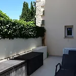 This accommodation includes a terrace, a living room, and a well-equipped kitchen and overlooks the garden.